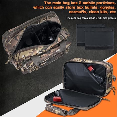 - 【Large Capacity】There are 3 small side zipper pockets on the front face, which can be used to store your small items. The first zipper pocket on the front has 6 elastic bands designed to store magazines of various sizes; the second middle layer is the main pocket comes with 2 removable partitions, which can easily store boxed bullets, goggles, earmuffs, cleaning kits, etc.; the third rear pocket can carry 2 full-size pistols.